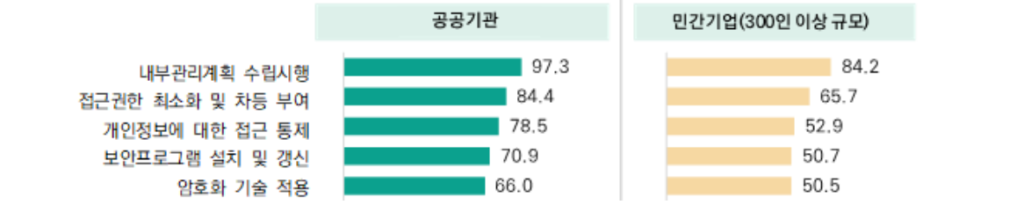 개인정보처리자 조사 결과로, 먼저 개인정보 안전성 확보조치를 살펴보면, 공공기관과 종사자수 300인 이상 민간기업 모두 ‘내부관리계획’을 수립·시행하였다는 응답(각 97.3%, 84.2%)이 가장 높았으며, ‘접근권한 최소화 및 차등부여’(각 84.4%, 65.7%), ‘개인정보에 대한 접근 통제’(각 78.5%, 52.9%) 순으로 나타났다.