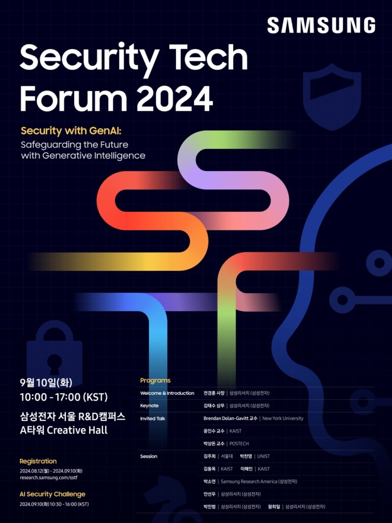 올해로 8회째를 맞은 이번 ‘삼성 보안 기술 포럼’은 ‘생성형 AI와 함께하는 보안: 생성형 지능과 함께 안전한 미래로 (Security with GenAI: Safeguarding the Future with Generative Intelligence)’라는 주제로 진행된다.