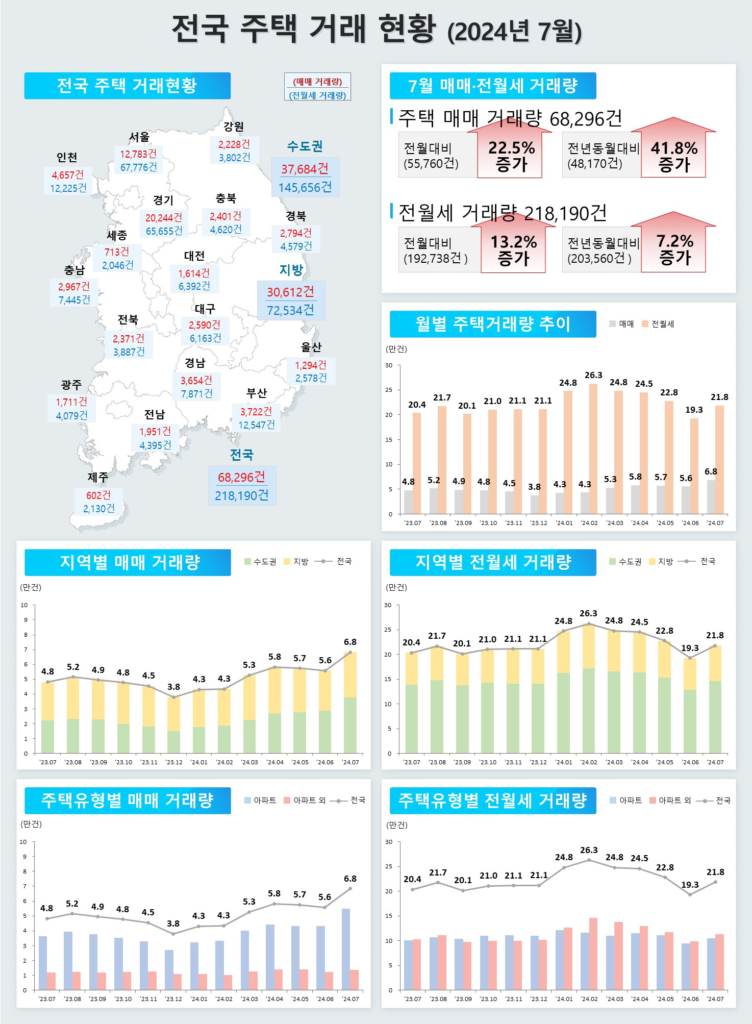 국토교통부가 2024년 7월 기준 주택 통계를 공표했다. 전반적으로 주택 매매량이 증가한것으로 나타났다. 지방의 경우도 30,612건으로 전월대비 13.1% 증가했다.