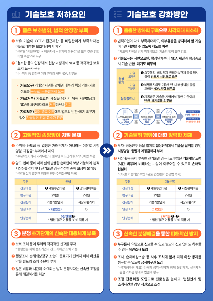 기술보호 사각지대 해소를 위해 스타트업의 혁신 기술을 폭넓게 보호하고, 협상·교섭 과정에서의 기술 요구·제공에 관한 법적 의무를 강화한다. 특히 비밀유지계약(NDA)을 모든 양자 관계로 확대 적용하고, 기술 요구를 반드시 서면으로 하도록 하는 등의 조치를 취할 예정이다.