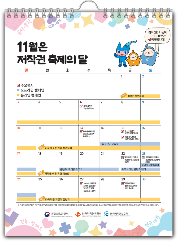 문화체육관광부가 11월을 '저작권 축제의 달'로 지정하고 저작권 존중과 보호 문화 확산을 위한 다양한 행사를 개최한다. 한국저작권위원회와 한국저작권보호원이 함께 주관하는 이번 행사는 국제 학술대회부터 유공자 포상, 토크콘서트까지 폭넓은 프로그램으로 구성되어 있다.