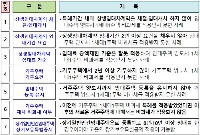 국세청이 공개한 실수사례를 보면, 상생임대주택 특례 기간 내 계약을 체결하지 않아 비과세 혜택을 받지 못한 경우, 임대기간 2년 요건을 채우지 못해 1세대1주택 비과세를 적용받지 못한 경우 등이 있었다.