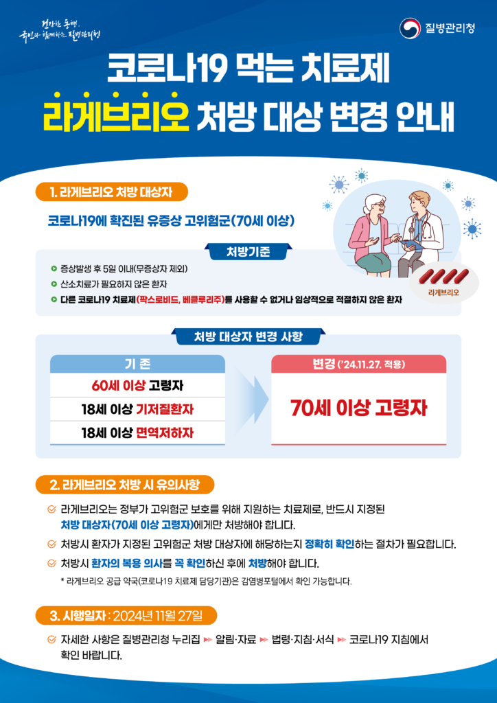 정부가 코로나19 치료제 라게브리오의 처방 기준 연령을 60세에서 70세로 상향 조정한다. 이 조치는 11월 27일부터 시행되며, 정부가 보유한 라게브리오 재고량 내에서 효율적으로 공급·사용하기 위한 방안이다.