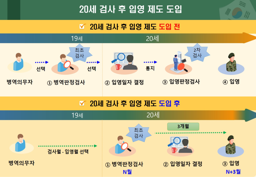 병무청이 2025년도 병역판정검사 일정을 공개하고 '20세 병역판정검사 후 입영' 제도를 새롭게 도입한다. 이에 따라 2025년 1월 13일부터 12월 17일까지 실시되는 병역판정검사의 일자와 장소에 대한 본인선택 신청을 12월 27일 오전 10시부터 받는다고 밝혔다.