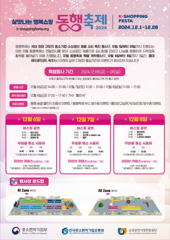 중소벤처기업부가 주최하는 '12월 동행축제' 개막행사가 6일부터 8일까지 서울 홍대 레드로드에서 열린다. 이번 행사는 연말을 맞아 중소기업과 소상공인 제품 구매를 통한 따뜻한 소비문화 확산을 목표로 기획됐다.