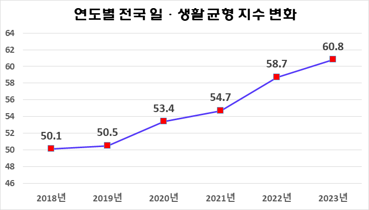 전국 평균 점수는 60.8점으로 전년 대비 2.1점 상승했다. 모든 지역에서 근로시간이 감소했고, 대부분의 지역에서 초과근로 감소, 휴가 사용기간 증가, 유연근무 도입률 증가 등 긍정적인 변화가 있었다.