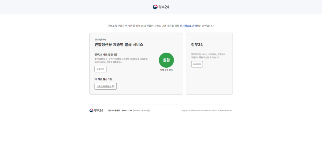 정부24 누리집에서 제공되는 이번 서비스를 통해 발급 가능한 증명서는 주민등록등본, 국민기초생활수급자증명서, 외국인등록사실증명서, 장애인증명서, 대학교재학증명서 등 총 5종이다. 특히 이번 서비스는 연말정산 기간 동안 전용 창구를 통해 제공되어 사용자의 편의성을 높였다. 행안부는 연말정산 기간 동안 급증할 것으로 예상되는 접속자를 위해 순번 대기 표시 기능을 도입했다. 이를 통해 서비스 이용 시 발생할 수 있는 불편을 최소화하고 정부24 운영의 안정성을 높일 계획이다.