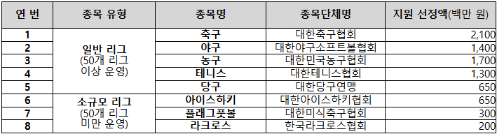 이번 심사 결과, 일반 리그에서는 축구, 야구, 농구, 테니스, 당구 등 대중적인 종목이 선정되었고, 소규모 리그에서는 아이스하키, 플래그풋볼, 라크로스가 포함됐다. 특히 동계 스포츠인 아이스하키가 처음으로 선정되었으며, 플래그풋볼과 라크로스는 각각 2028 LA 올림픽과 2030 도하 아시안게임 신규 종목으로 채택된 바 있어 청소년들에게 새로운 경험을 제공할 것으로 기대된다.