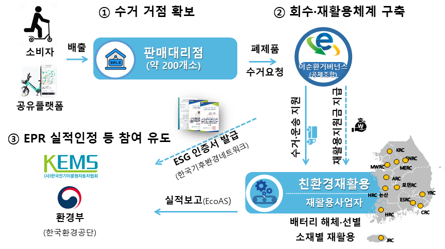 이병화 환경부 차관은 "개인형 전동 이동장치 등 새로운 유형의 폐자원을 효과적으로 관리하기 위해 민관 협력을 확대하고, 전기전자제품 생산자책임재활용제도 대상을 전 품목으로 확대하는 등 법과 제도를 지속적으로 개선해 나가겠다"라고 밝혔다. 시민들은 이순환거버넌스 누리집 알림창을 통해 가까운 수거 거점 위치와 구체적인 배출 방법을 확인할 수 있다.