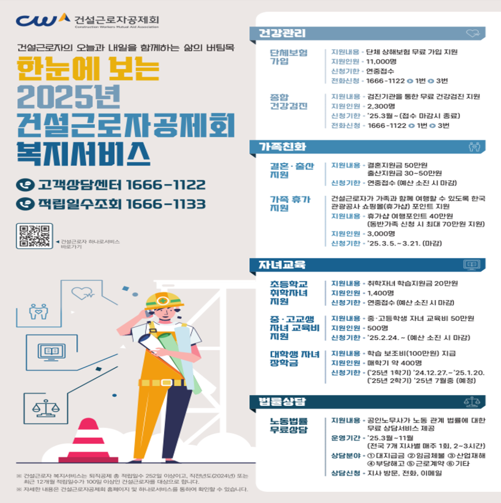 건설근로자공제회가 올해 60억 원 규모의 복지서비스를 통해 2만 1천명의 건설근로자를 지원한다고 17일 밝혔다. 이번 복지서비스는 건설근로자의 생애주기를 고려한 맞춤형 지원으로, 건강관리, 가족친화, 자녀교육, 노동법률 상담 등 4개 분야 8종의 종합 복지서비스로 구성됐다.