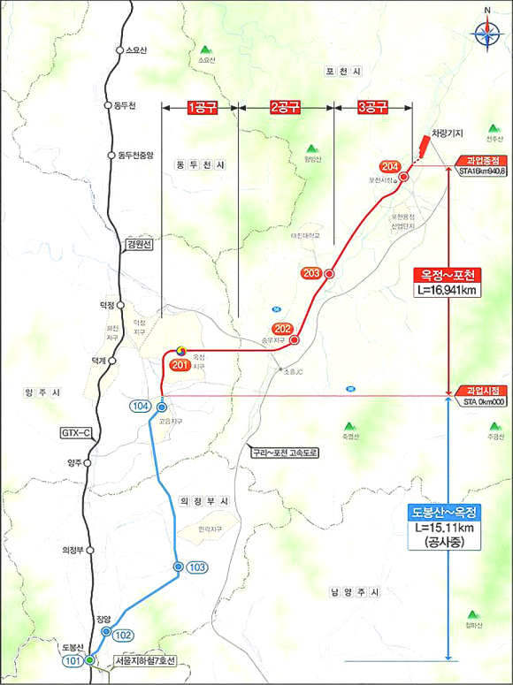 '옥정~포천선'은 서울 지하철 7호선을 북쪽으로 연장하는 '도봉산~포천선'의 2단계 구간으로, 양주시 고읍에서 포천시 군내면까지 이어진다. 총사업비 1조 5067억 원을 투입해 16.9km 구간에 정거장 4개소와 차량기지 1개소를 설치하는 대규모 프로젝트다.