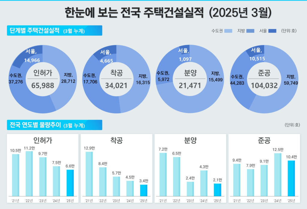국토교통부(장관 박상우)는 2025년 3월 기준 전국 주택통계를 발표했다. 이번 통계에 따르면 수도권을 중심으로 주택 인허가 물량이 큰 폭으로 증가했으나, 착공과 준공 실적은 지역별로 상반된 흐름을 보였다.