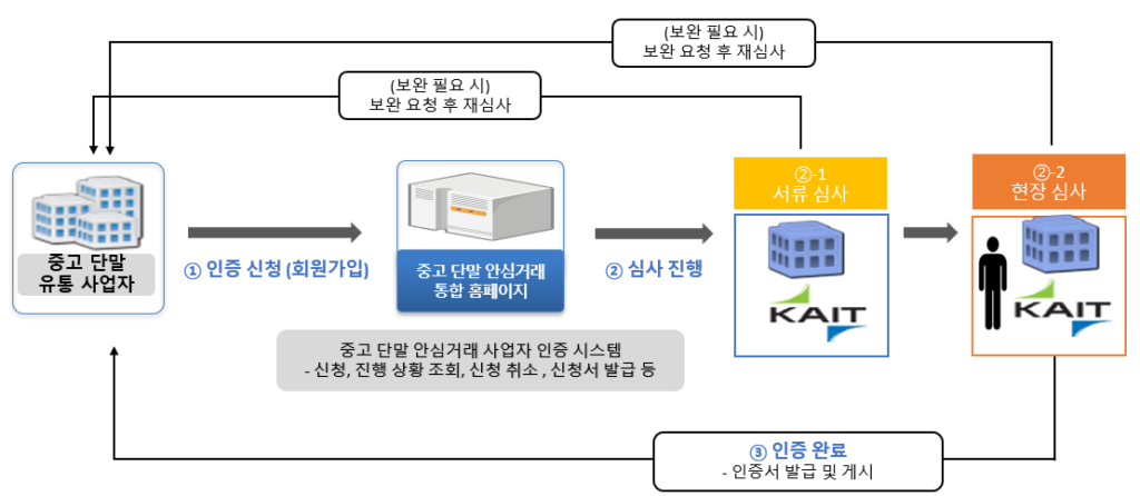 중고폰 안심거래 사업자 인증제도는 개인정보 보호와 가격 투명성 등의 요건을 갖춘 유통사업자를 정부가 직접 인증하는 제도다. 이 제도는 공장 초기화 및 개인정보 삭제 절차의 마련, 삭제 확인서 발급, 등급 기준과 가격에 대한 정보 제공 등 소비자 보호를 위한 핵심 기준을 포함하고 있다. 사업자가 이러한 요건을 충족하면 한국정보통신협회(KAIT)의 서류심사와 현장실사를 통해 ‘안심거래 사업자’ 인증을 받을 수 있다.