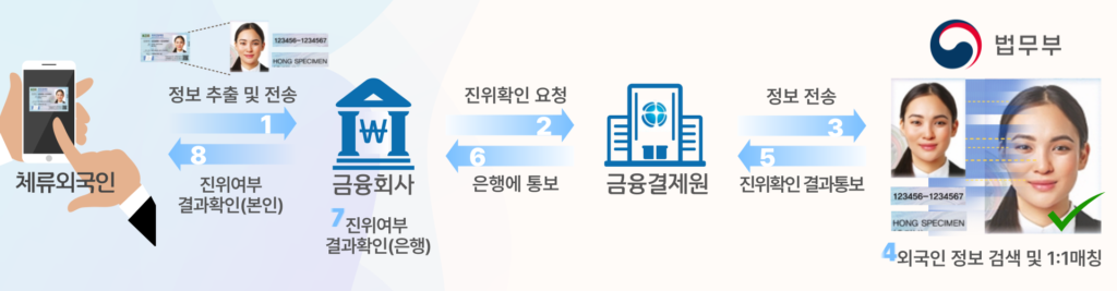 외국인등록증 진위확인 서비스는 외국인이 은행 창구나 모바일 앱 등에서 금융 업무를 할 때, 금융기관이 해당 외국인의 등록정보를 법무부가 보유한 데이터베이스와 실시간으로 대조해 진위를 확인하는 시스템이다. 이 서비스는 외국인등록증뿐만 아니라 영주증, 외국국적동포의 국내거소신고증도 포함된다.