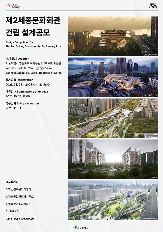 최종 선정된 설계팀은 14개월간 기본 및 실시설계 용역을 수행하고, 2026년 12월 공사에 착수해 2029년 12월 완공하는 일정이 확정됐다. 조남준 서울시 도시공간본부장은 “제2세종문화회관이 시민 일상에 자연스레 스며드는 문화 플랫폼 역할을 하게 될 것”이라며 “서울의 문화 위상을 세계에 알릴 상징적 공간으로 거듭날 수 있도록 완성도 높은 설계안을 기대한다”고 밝혔다.