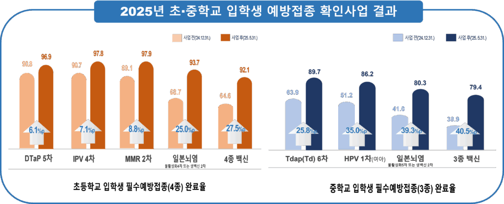 전년도와 비교하면 초등학생 예방접종률은 소폭 하락(92.3%→92.1%)했지만, 중학생은 3.0%포인트 상승(76.4%→79.4%)해 전체적으로 안정적인 수준을 보였다. 예방접종 항목은 초등의 경우 DTaP, IPV, MMR, 일본뇌염 등 4종, 중등의 경우 Tdap(Td), 일본뇌염, 여아 대상 HPV등 3종이다.