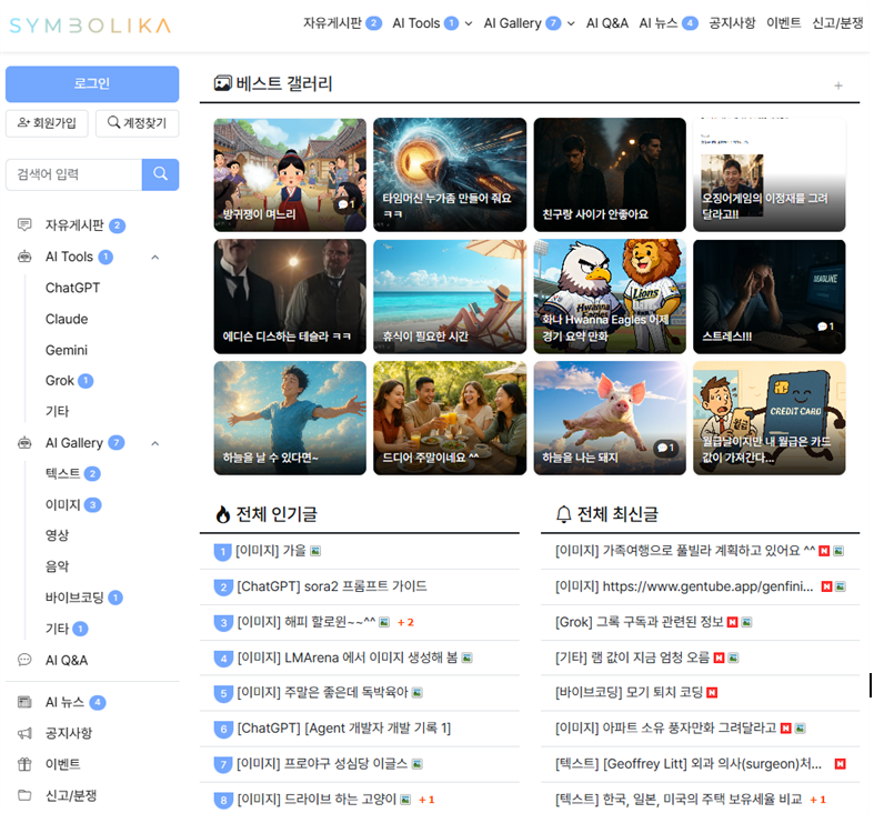 심볼리카는 생성형 AI를 중심으로 사용자가 직접 정보를 배우고, 실험하고, 창작 결과를 공유하는 참여형 커뮤니티다. 단순한 정보 게시판이나 기술 포럼을 넘어 사용자 주도의 실험문화와 창작 교류를 목표로 한다. 챗GPT, 클로드(Claude), 제미나이(Gemini), 그록(Grok) 등 글로벌 AI 도구 활용 사례를 비롯해 이미지 생성, 프롬프트 연구, AI 기반 콘텐츠 제작 등 폭넓은 주제를 다루며, 일반 사용자부터 전문가까지 모두 참여할 수 있도록 설계됐다.