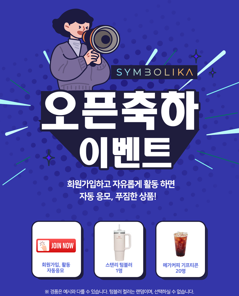 한편, 심볼리카는 정식 서비스 개시를 기념해 ‘오픈축하 이벤트’를 진행 중이다. 회원 가입 후 게시글 작성이나 댓글 참여 등의 커뮤니티 활동을 하면 자동으로 응모된다. 당첨자에게는 스탠리 텀블러, 메가커피 기프티콘 등이 증정되며, 이벤트는 10월 30일까지 진행된다.