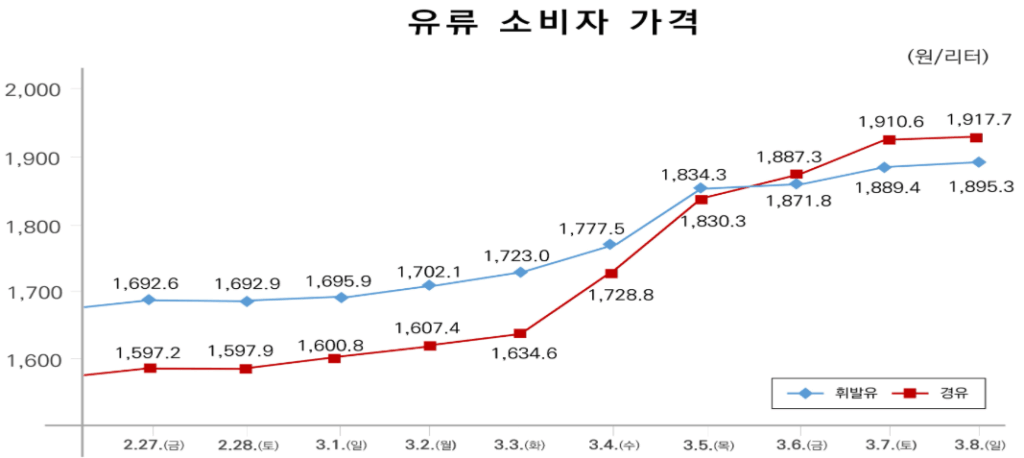 국내 휘발유・경유 소비자 가격 추이. (사진=연합뉴스)