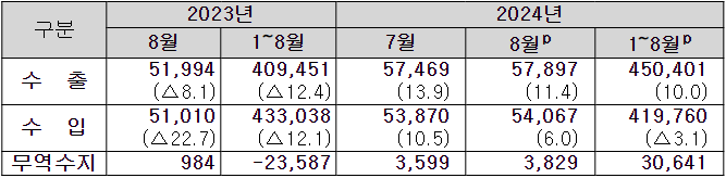 8월 수출입 현황, 수출 579억 달러로 전년동기대비 11.4% 증가… 11개월 연속 증가세 기록
