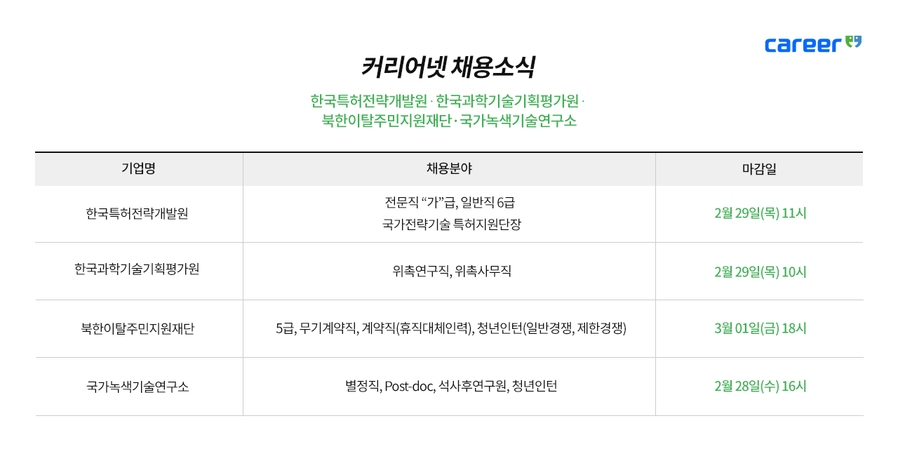 커리어넷, 한국특허전략개발원·한국과학기술기획평가원·북한이탈주민지원재단·국가녹색기술연구소 채용 소식 발표