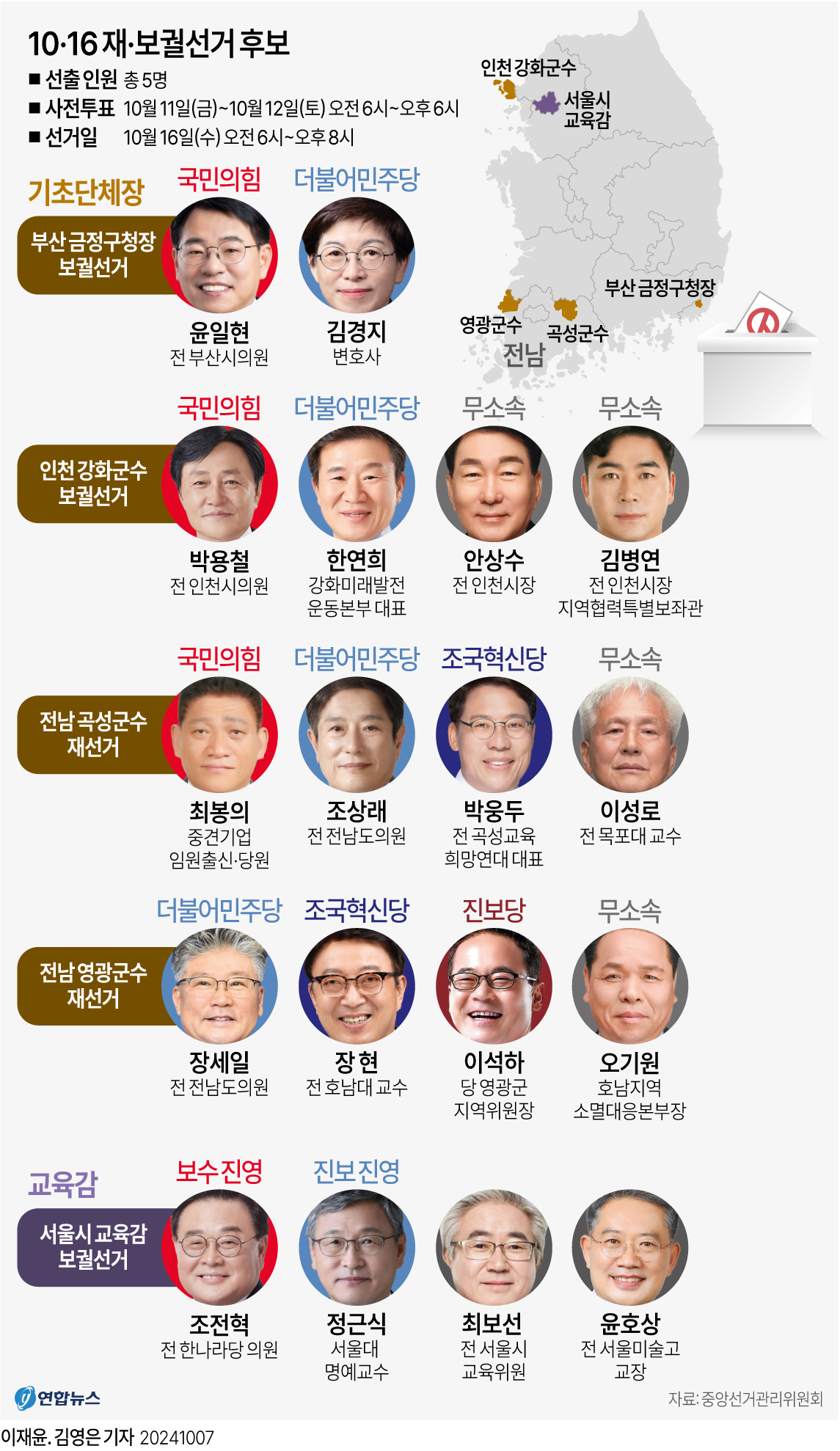 10월 16일 재보궐선거 실시, 5개 지역 유권자 선택 주목
