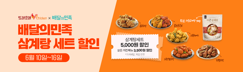 농협목우촌 또래오래, 배달의 민족에서 치킨+삼계탕 세트 할인 판매