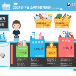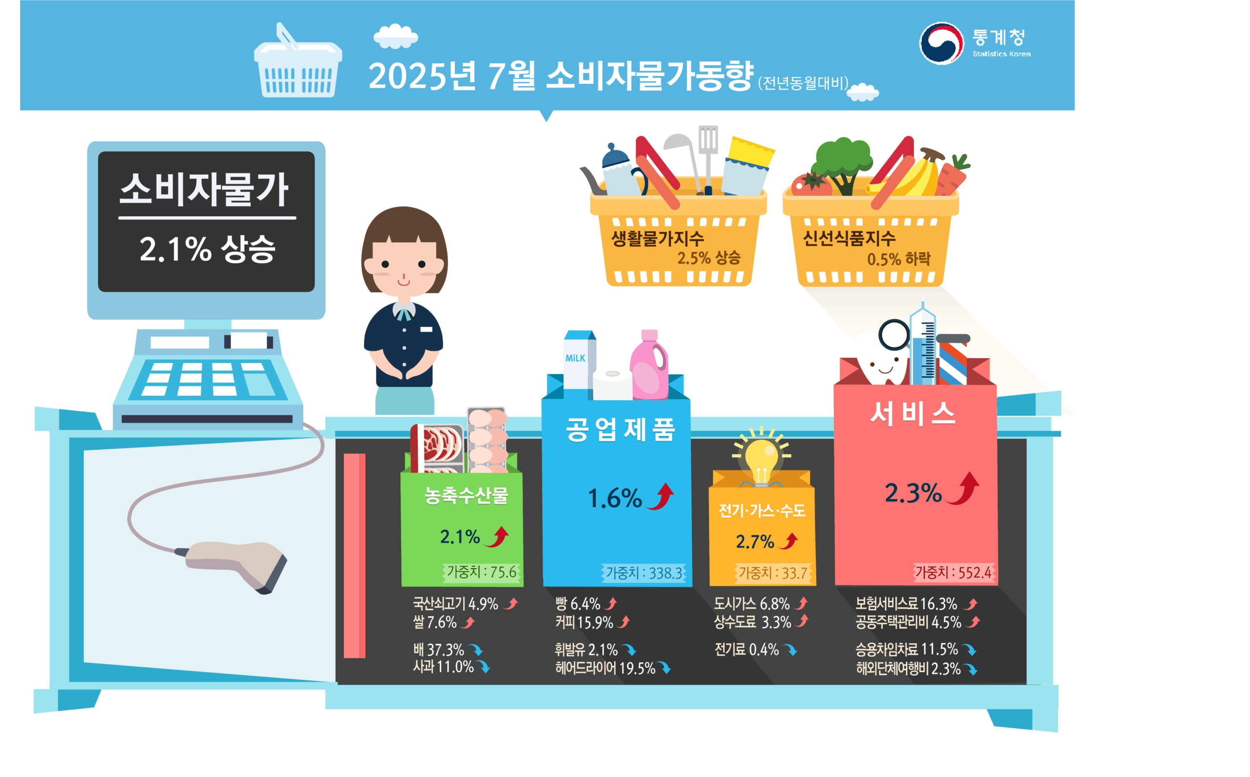 2025년 7월 소비자물가 2.1% 상승, 식료품·서비스 가격 상승 주도하며 생활물가 부담 지속