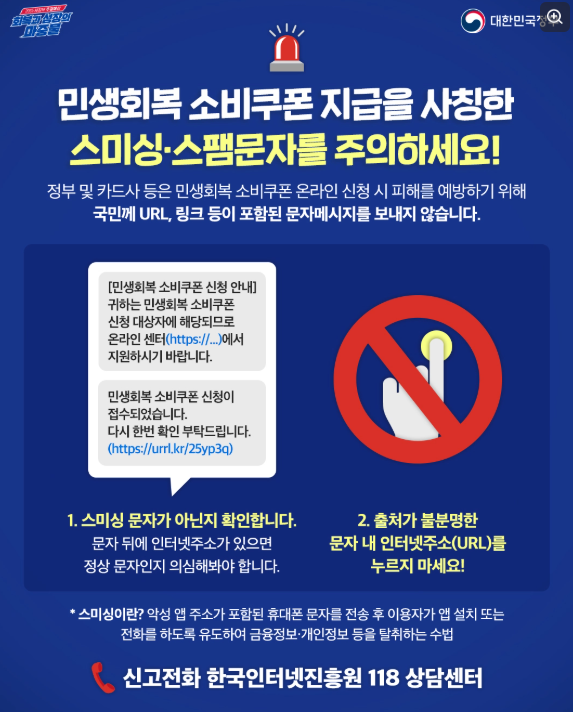 “2차 소비쿠폰 URL 문자 100% 사기”…정부, 스미싱 특별 경보 발령