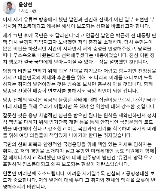 "국민 망각 발언? 오해입니다"… 윤상현, 논란의 유튜브 발언 해명