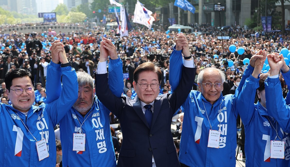 이재명, '청·적 운동화' 신고 첫 유세…“진보·보수 넘어 통합과 실용으로”