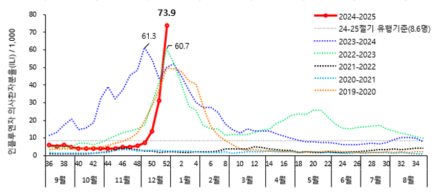 지난주 인플루엔자 의심환자 외래환자 1천명당 73.9명… 전주 대비 136% 급증