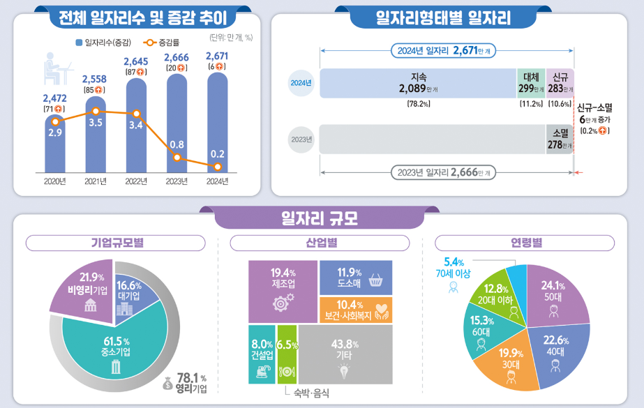 2024년 일자리 2671만개…중소기업 61.5% 차지, 비영리기업 15만개 증가로 고령층 고용 확대