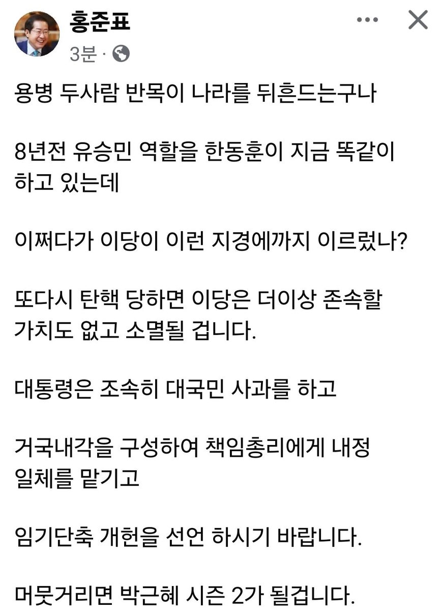 홍준표, 윤석열-한동훈 '용병' 비판... "보수당의 자멸"