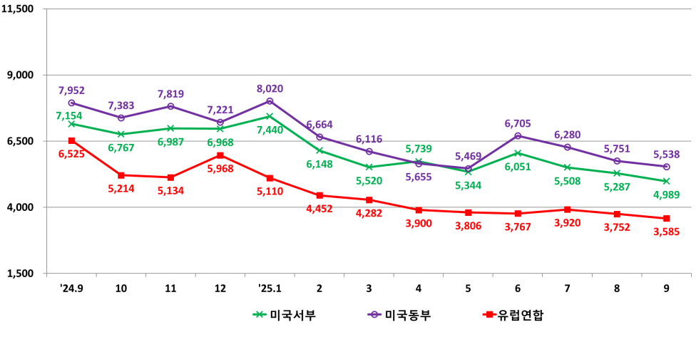 2025년 9월 수출입 운송비용 다변화, 미·유럽·일본 하락세 속 중국만 운임 상승