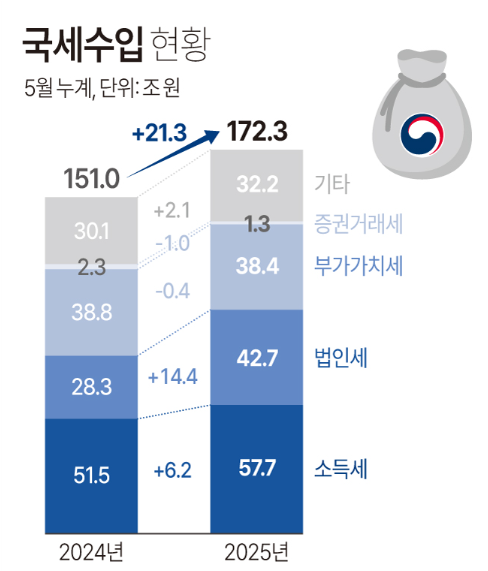 국세수입 5월 30.1조원 기록, 전년 동월 대비 4.7조원 증가…연초 누적 172.3조원에 달해